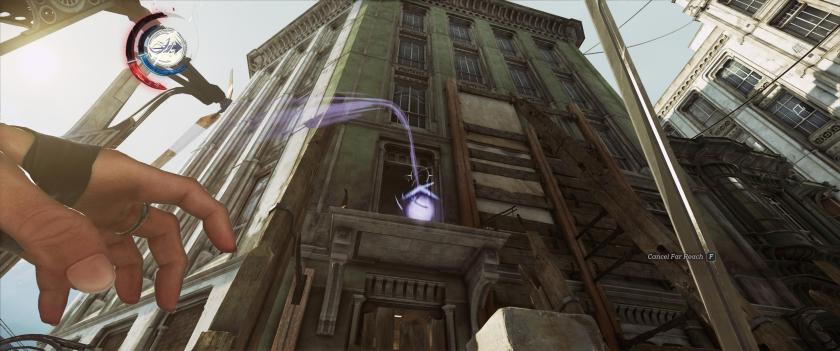 Verticality is emphasized more in Dishonored 2 than its predecessor. For example, you can use a power called Far Reach to reach ledges, balconies, and other high places with ease. (Later you can upgrade this power to grab adversaries and fling them about, or pull them towards you while delivering a sword to the face — which are all quite entertaining methods of execution.