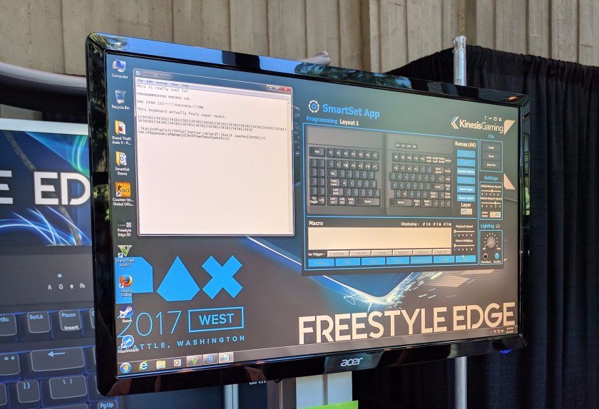 The Freestyle Edge feels good under the fingertips (as I would expect from Cherry MX Brown switches, which the floor model used), and I love the idea of built-in drivers so I don’t have to install them on the PC—or ALT+TAB out of a game to access them. The Kinesis Gaming rep at PAX West indicated the next production run would also be available with Cherry MX Red and Cherry MX blue switches.