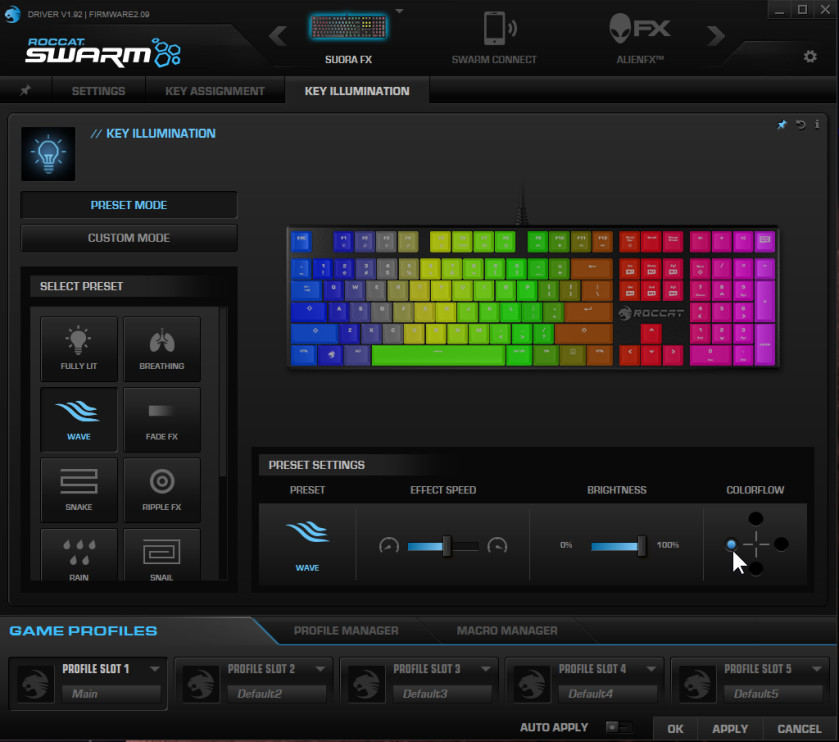 You can store up to 5 onboard profiles, each with their own colors and settings, but switching between them is also a bit awkward. The Suora F/X lacks a dedicated profile switch key, so you either have to do it manually in the software, or set up associated applications to launch each profile.
