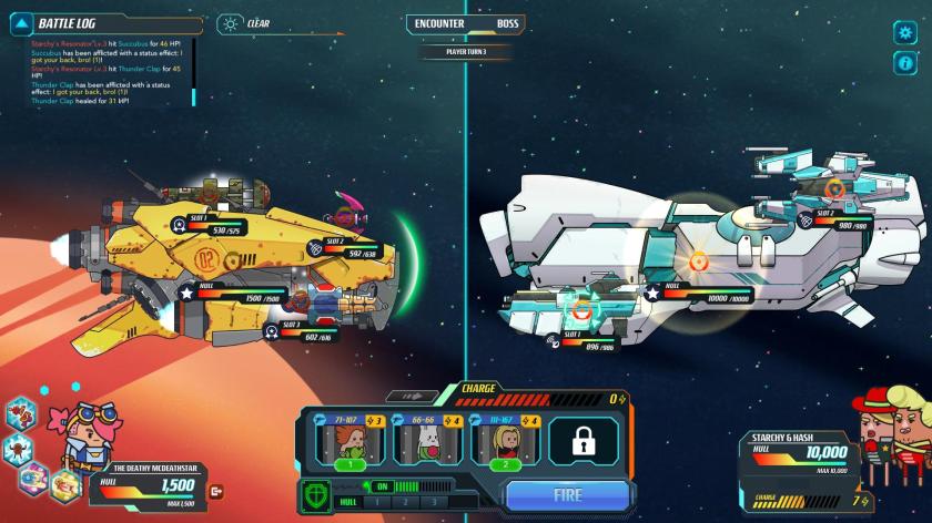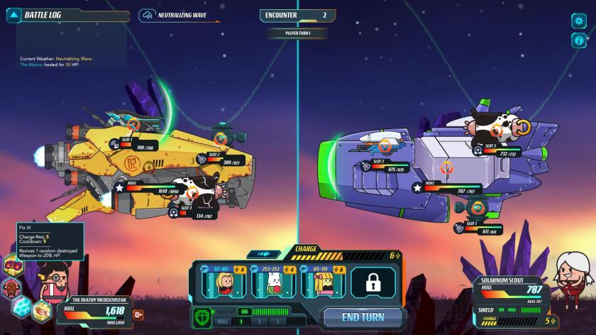 Even so, Holy Potatoes! We’re in Space?! still packs a surprising amount of depth into its otherwise simplistic mechanics. Combat, for example, requires you to balance ship energy (‘charge’ in the game) to fire weapons, power shields, and trigger special abilities each turn.