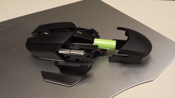 Once the awe ears off and you tear into the lower part of the box, you’ll find the USB cable, charging pedestal, a tiny screwdriver, a 2500mAh NiMH rechargeable battery, and the replaceable side panels. Razer stickers and documentation are also inside.