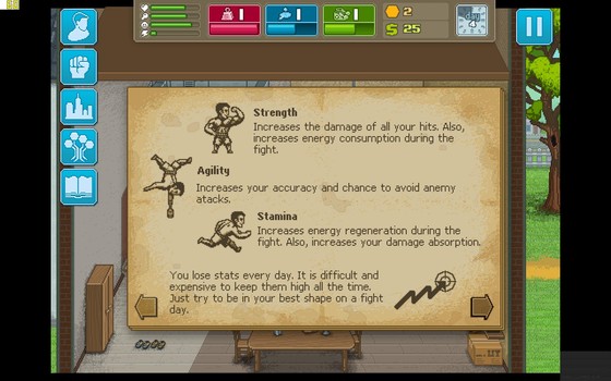 Living, training, and improving are definitely a tricky balancing act. Building up your fighter is a struggle to gain a daily net increase in Strength, Agility, and Stamina. Every day your stats drop slightly, so you must train enough to overcome that and increase them. There are also certain skills you can buy that prevent an attribute from dropping below a certain value.