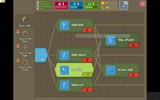 There are a huge number of fighting skills in the game divided amongst 4 ‘trees’. The first tree is general, and the remaining 3 represent a style of fighting keyed to one of the main attributes: Way of the Tiger (Agility), Way of the Bear (Strength), and Way of the Turtle (Stamina, which is essentially defense, in case you’re curious as to why a Turtle would be tied to Stamina).