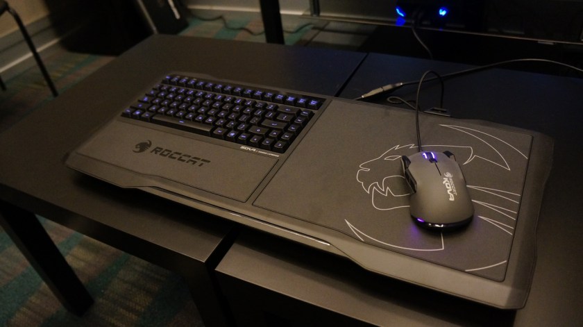 The ROCCAT Sova sits a bit in between the Turret and the Lapdog. Like the Corsair Lapdog, it’s a wired solution, but the keyboard is built into the board—but the keyboard is at the front of the Sova, and leaves ample space to rest your wrists. It also gives you the freedom to use any gaming mouse, and it provides a large mouse surface area. It’s spacious, but smaller than the Lapdog and larger than the Turret.